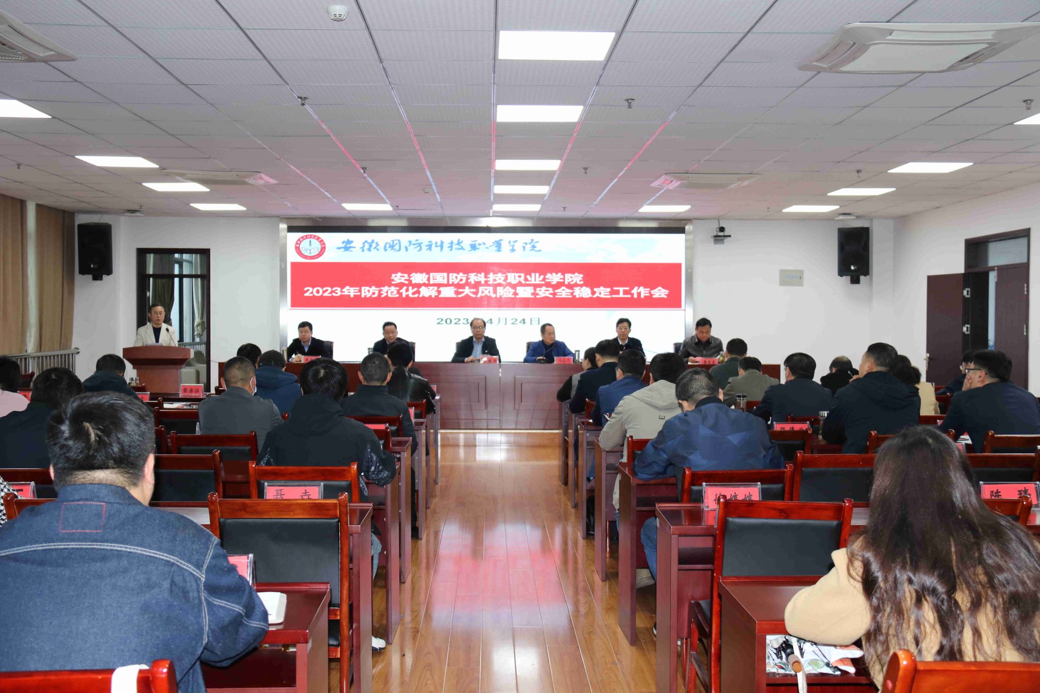 4月24日上午,学校在秉心楼12楼会议室召开2023年防范化解重大风险暨安全稳定工作会议,会议由党委副书记冯伦久主持,校领导李麟书、丁守宝、袁旗、李存鹏出席会议,各职能部门主要负责同志、各二级学院中层正副职、安委会成员、辅导员参加了会议。