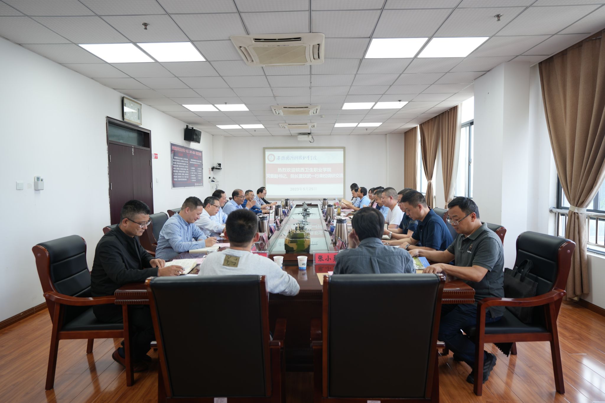 本网讯(党政办)5月25日下午皖西卫生职业学院党委副书记、院长夏跃武,党委委员、副院长方士英一行来万象城官网开展考察交流。校党委副书记、校长李麟书热情接待了来宾,校领导袁旗及各部门、二级学院有关负责人参加了座谈交流会。座谈交流会在秉心楼第一会议室召开。