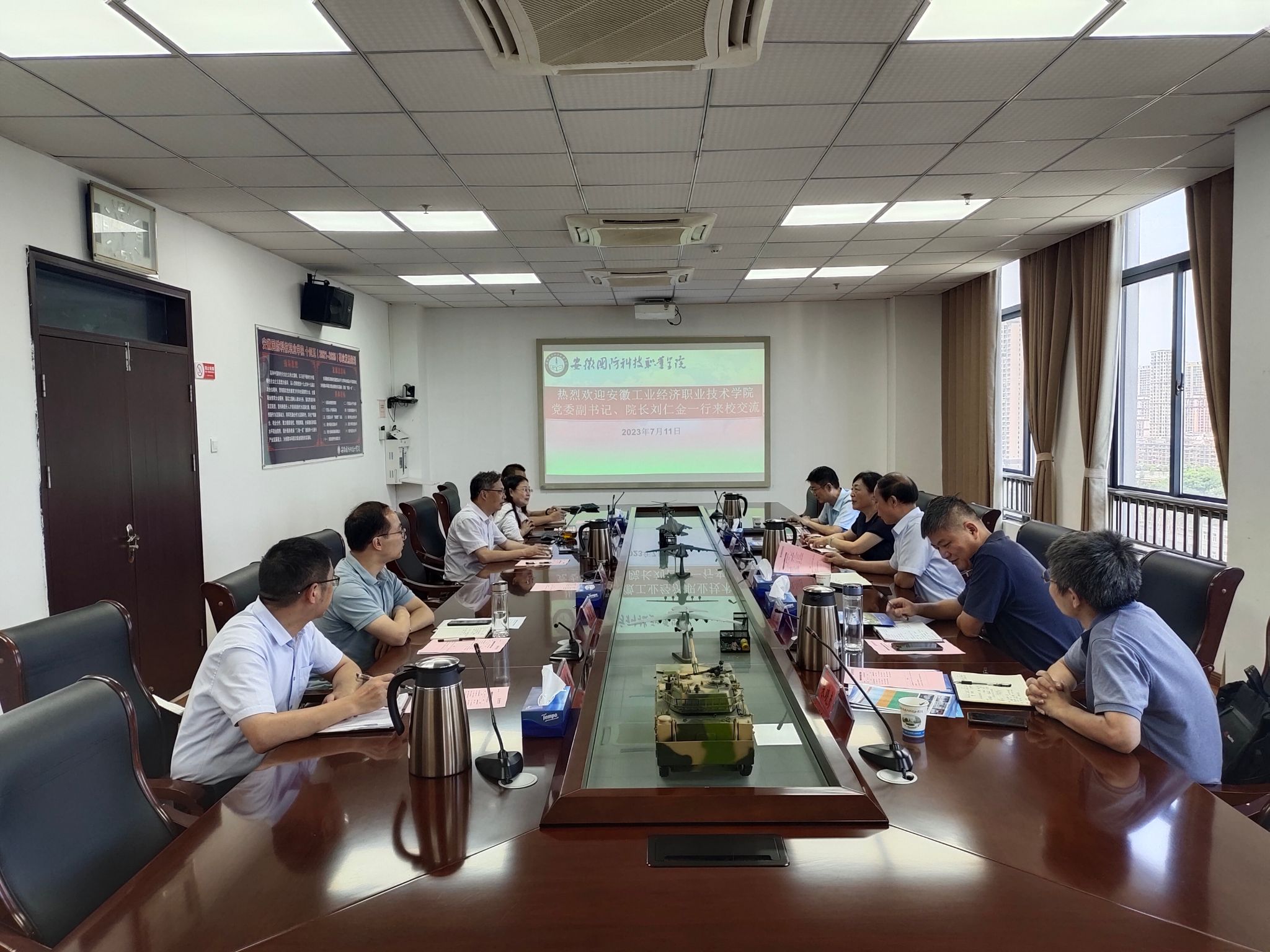 本网讯 7月11日,安徽工业经济职业技术学院党委副书记、院长刘仁金一行来万象城官网考察调研,校党委书记余嗣元热情接待了来宾,并在秉心楼第一会议室举行了座谈会。教务处及相关二级学院主要负责同志参加了座谈会。