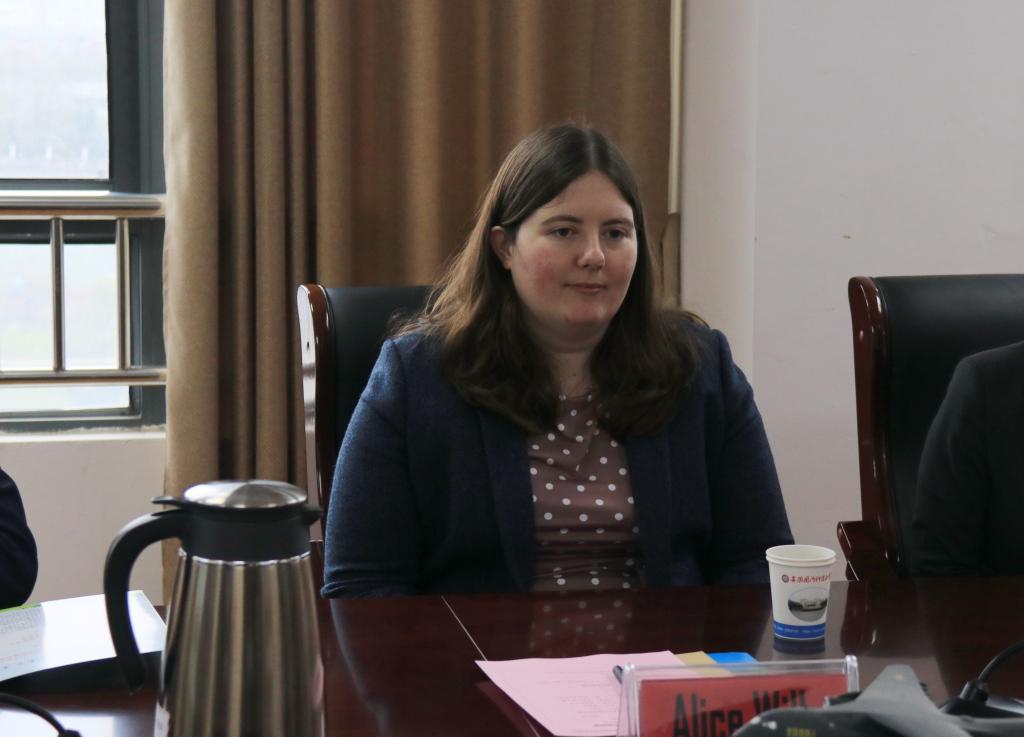 英国胡弗汉顿大学国际合作院院长Alice Wilby听取学校介绍