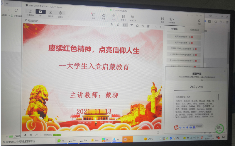 (马克思主义学会指导教师 戴柳)为了激发同学们的入党热情,增强对中国共产党的了解和认识,端正入党动机,把握入党程序和要求,2021年11月13日晚上6点,马克思主义学会在线上召开大学生入党启蒙教育大会。此次大会由社团指导老师戴柳主讲,全校近300名学生参加。