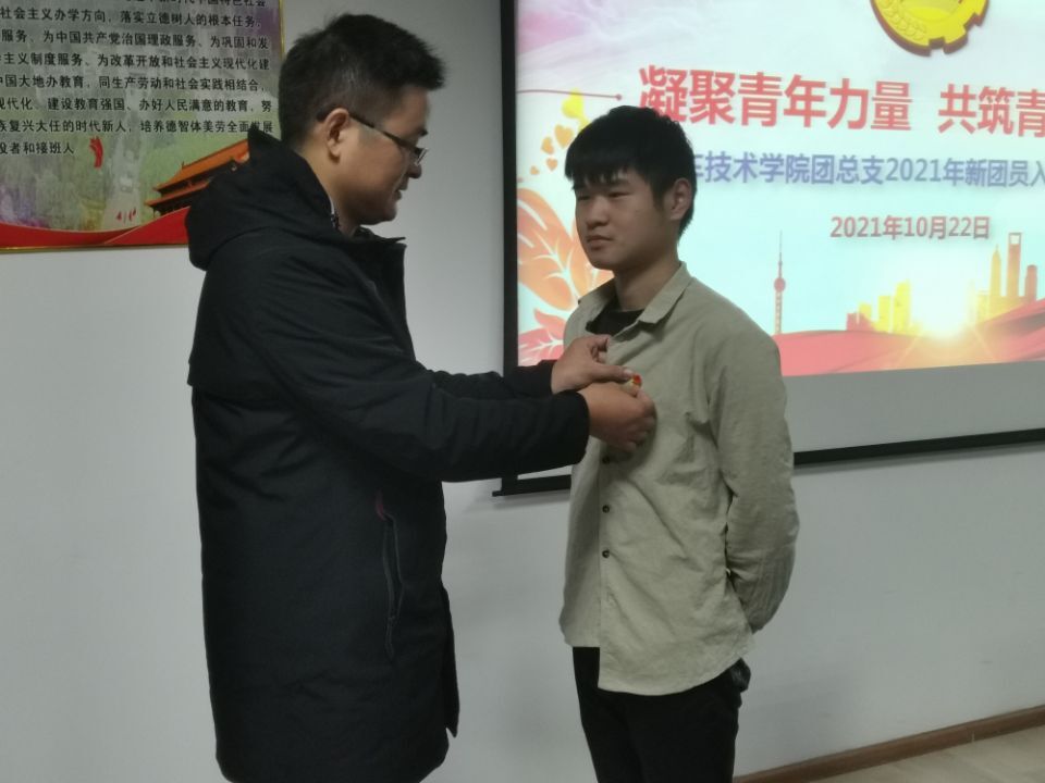 宣誓仪式在雄壮的国歌声中拉开帷幕。朱老师首先宣读校团委《关于同意汽车技术学院2021年团员发展的批复》,宣读了新团员名单并并对他们表示祝贺。朱老师现场为8名新团员佩戴团徽。