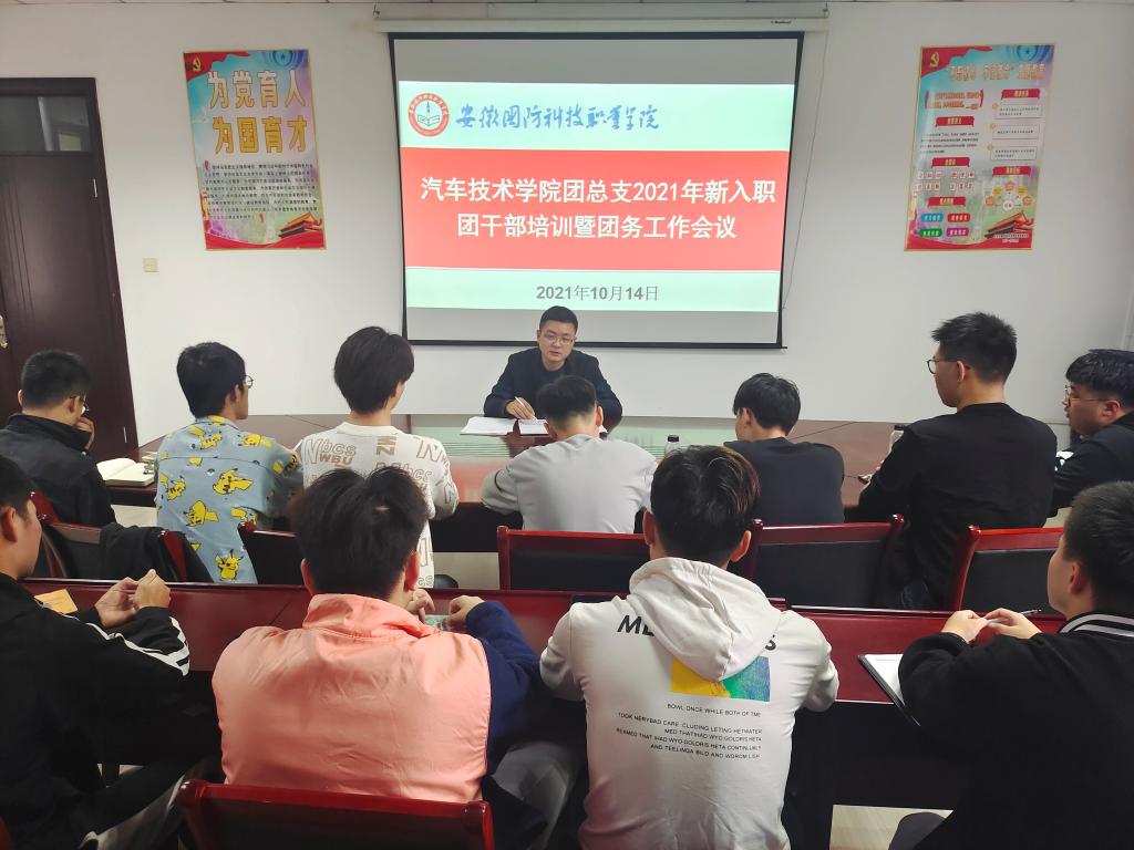 为深入推进从严治团和团组织规范化建设,培养造就高素质的团干部队伍,更好地完成团务工作,10月14日中午,汽车技术学院团总支在知行楼416会议室召开2021级新入职团干部培训暨团务工作例会。汽车技术学院辅导员兼团总支负责人朱其阳出席会议,会议由团总支副书记严健峰同学主持,2021级全体新生班级团支部书记、团支部委员按时参加会议。