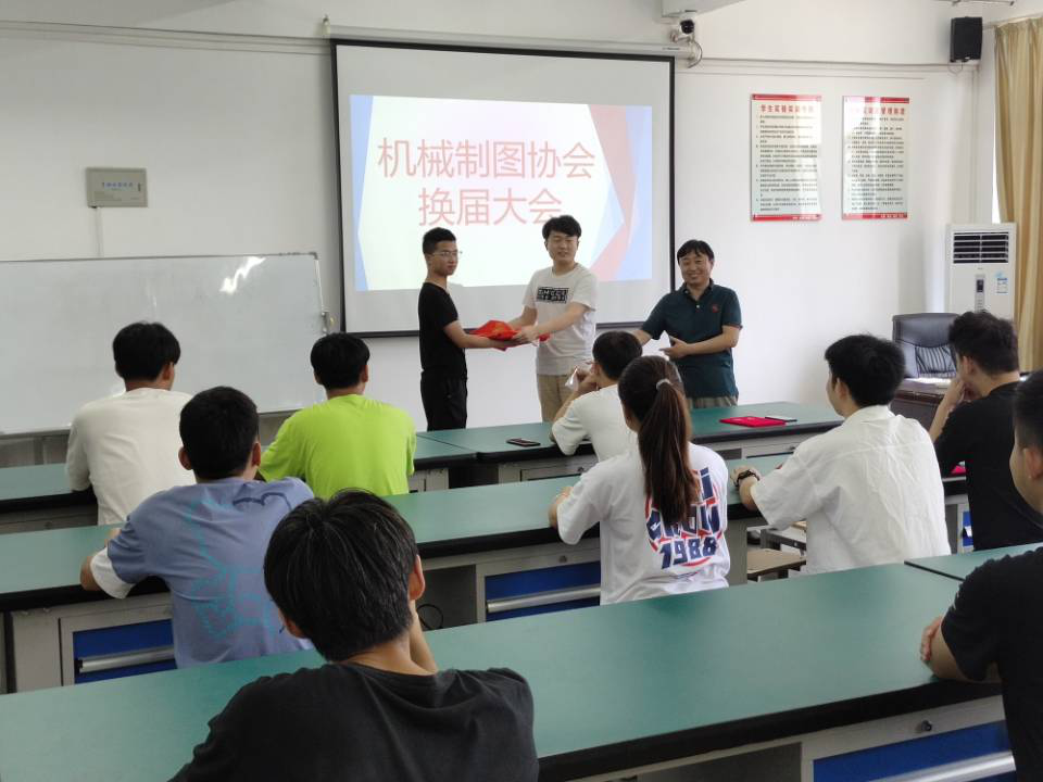接着本届会长赵锐,副会长陈新莲、董鹏三人对老师以及同学们的信任表示非常感谢,并对以后的工作进行了简单的介绍,力争让机械制图协会有好的发展;并完成机械制图协会会旗交接仪式。