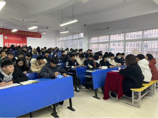 1月6日经贸管理学院团总支在2教105教室召开诚信迎考动员大会,团总支书记付玉梅、学生会主席团、各班班干及学生会全体成员参加此次动员会,会议由第十六届学生会主席葛恒同学主持。