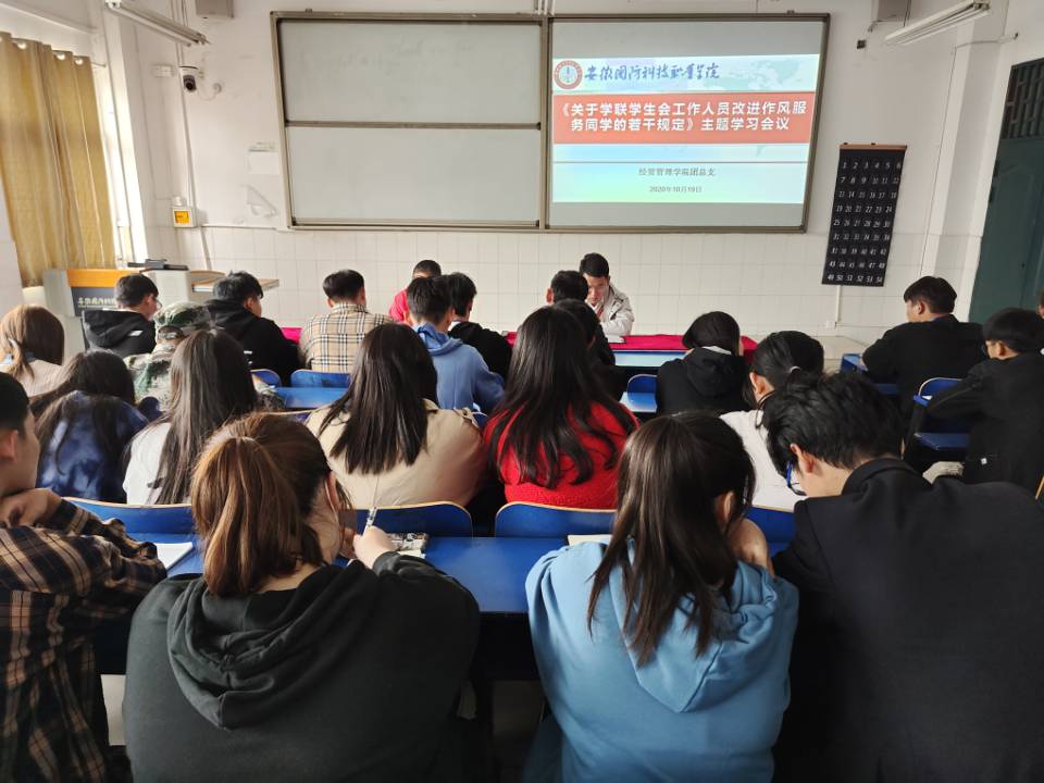 各团学组织认真学习《关于落实共青团和学联对高校学生会(研究生会)指导管理责任的若干规定(试行)》《关于学联学生会工作人员改进作风服务同学的若干规定》等相关文件,教育学生要胸怀崇高理想、恪守学生本分,牢记服务宗旨,以更高的标准要求自己,守纪律、讲原则、做表率,塑造清新阳光的组织形象。