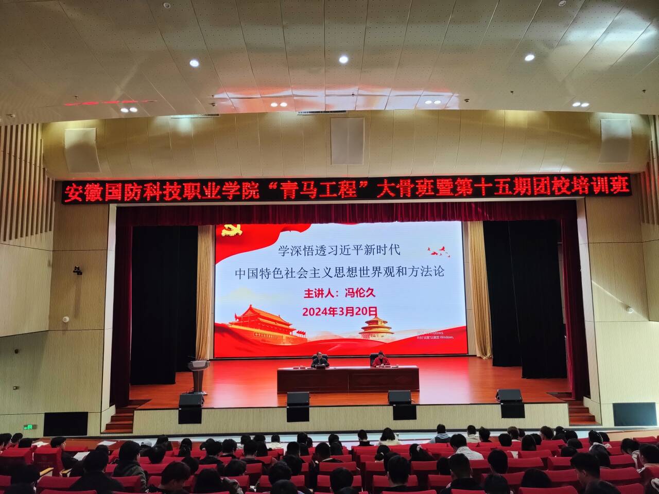 3月20日下午,校党委副书记冯伦久应邀作了题为《学深悟透习近平新时代中国特色社会主义思想世界观和方法论》的专题讲座。会议由党委委员、宣传部部长、校团委书记陈思主持,全体专兼职团干部、“青马工程”培训班学员共计250余人参加学习。