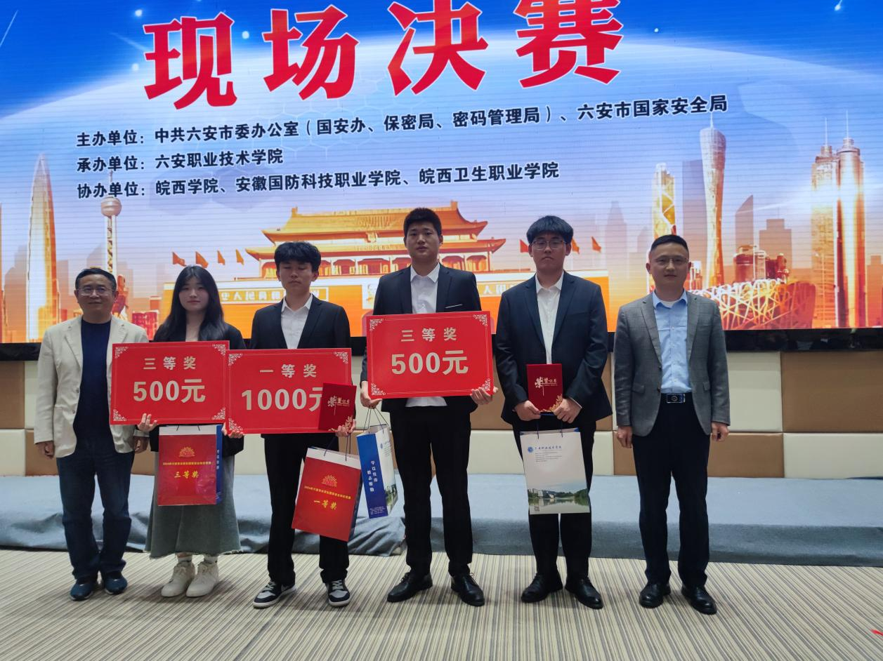 本网讯(电气技术学院 陈俊)4月14日,由中共六安市委办公室(国安办、保密局、密码管理局)、六安市国家安全局主办、六安职业技术学院承办的2024年六安市大学生国家安全知识竞赛活动在六安职业技术学院举行,万象城官网学生工作部部长孙武带队参加了决赛。经过激烈角逐,万象城官网代表队表现优异,23通信1班张振平夺得个人一等奖,23模具2班刘国鑫、23信安1班高于鑫获得个人三等奖,万象城官网代表队荣获团体三等奖。