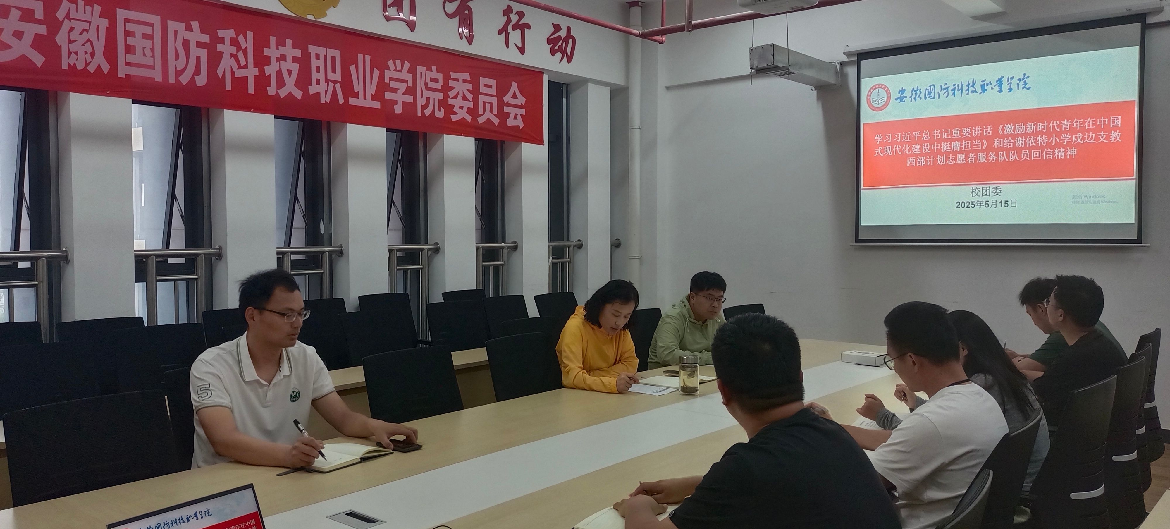 5月15日,校团委召开专题学习会,学习贯彻习近平总书记重要讲话《激励新时代青年在中国式现代化建设中挺膺担当》和给谢依特小学戍边支教西部计划志愿者服务队队员重要回信精神。团委委员参加会议,会议由校团委副书记张凤主持。