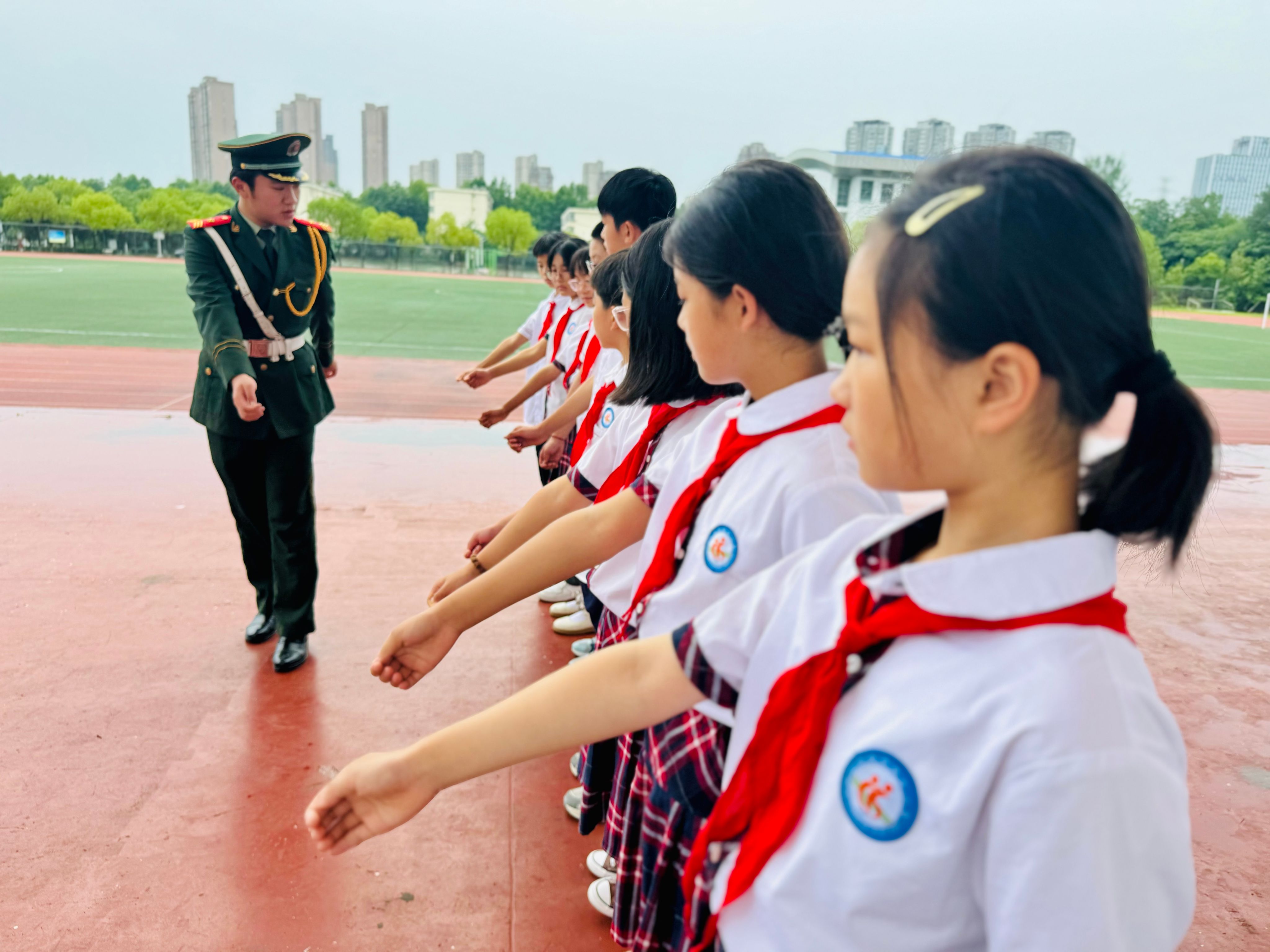 伴随着清晨的第一缕阳光,在雄壮的国歌声中,团队成员迈着铿锵有力的正步走向升旗台,队员们目光坚毅、动作整齐划一,通过精准的出旗、展旗、升旗等动作为城北小学师生示范升旗流程。随后,团队成员分组手把手对少先队员们进行立正、稍息、齐步走、正步走等动作指导,充分发挥榜样引领作用。