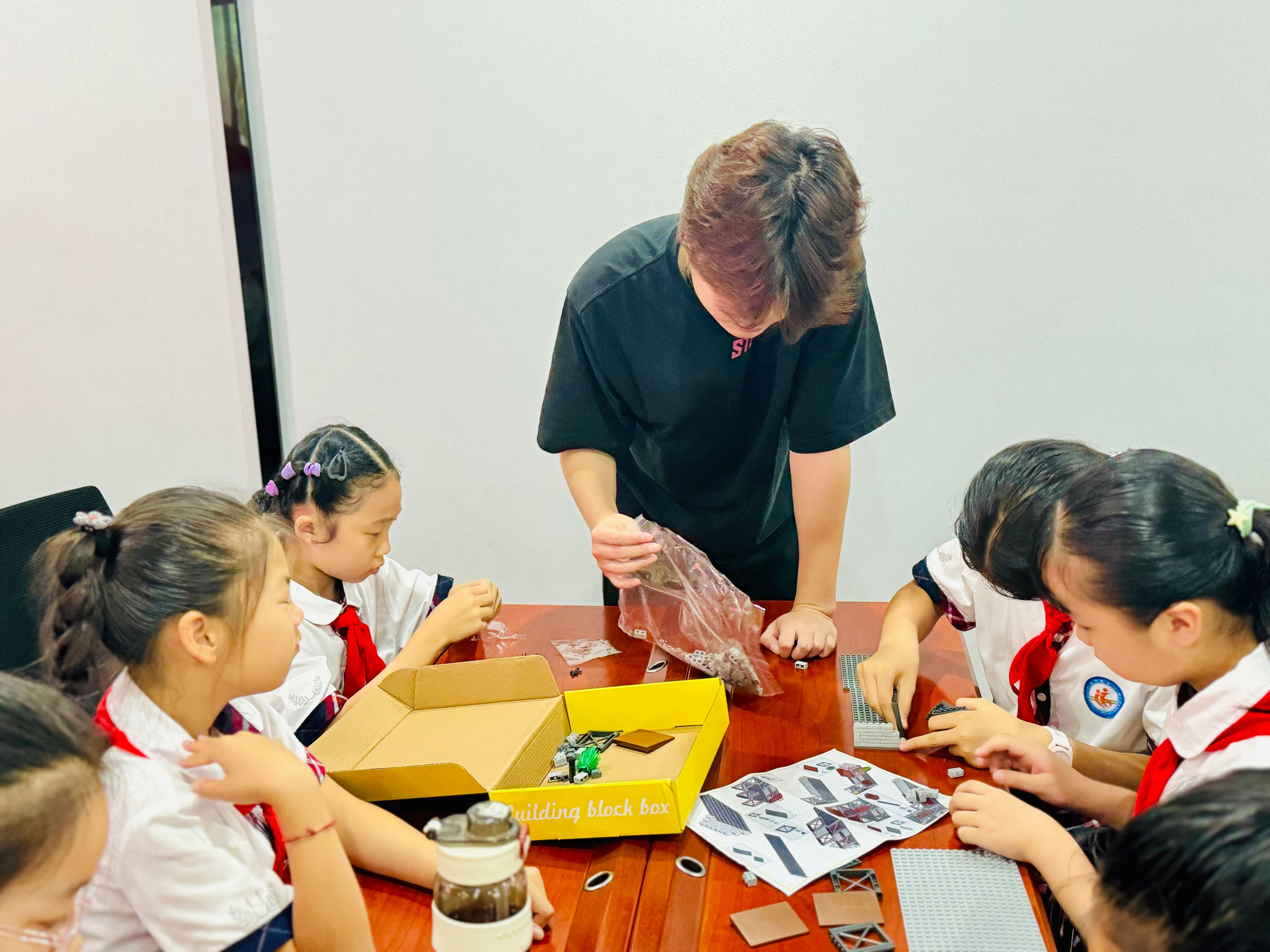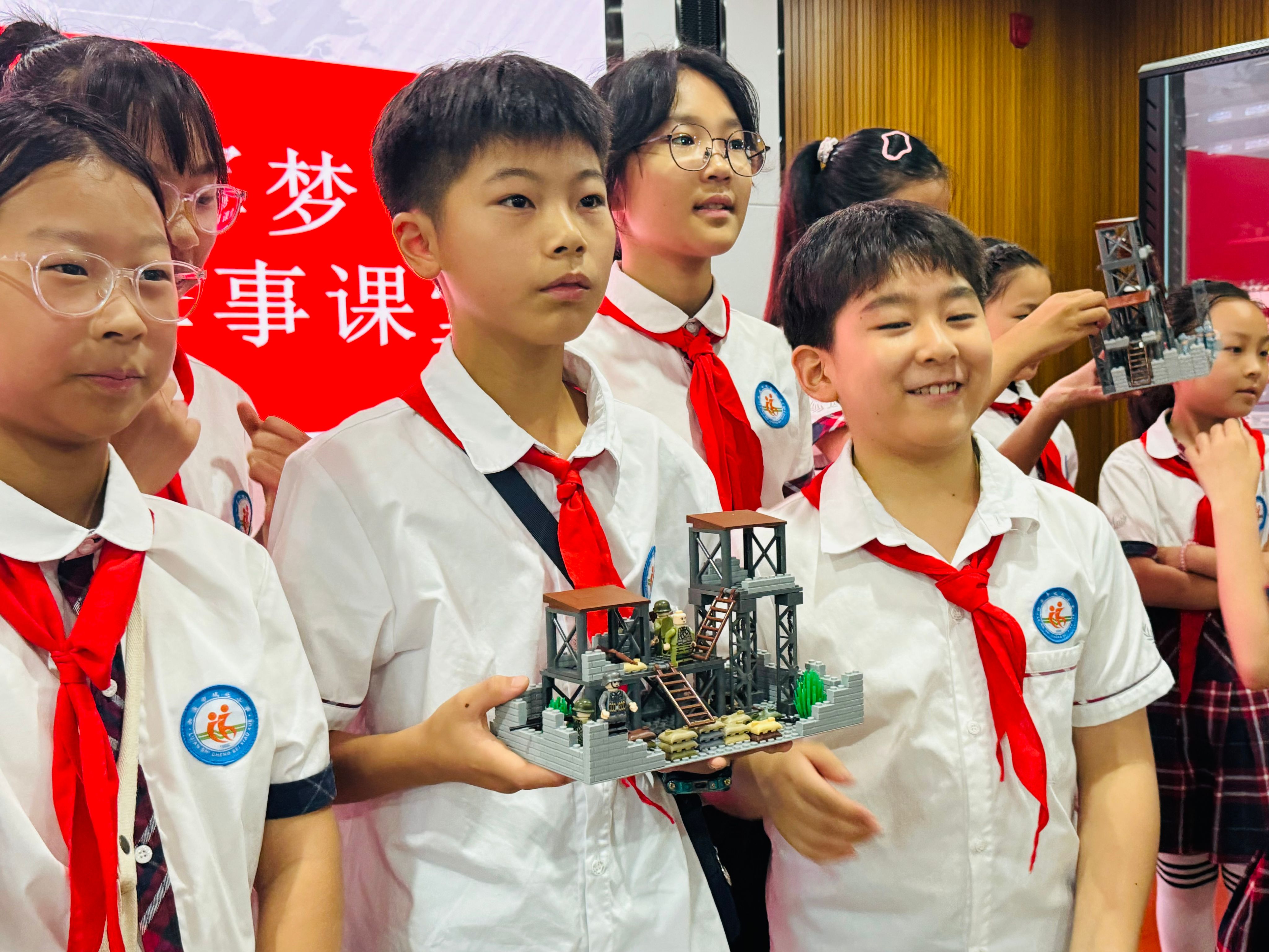 故事分享结束后,团队成员组织开展积木搭建模拟战役游戏。孩子们兴致盎然,全神贯注聆听规则讲解,小心翼翼搭建"作战工事"。在寓教于乐的互动体验中,一颗颗爱国强军的种子正悄然生根发芽。