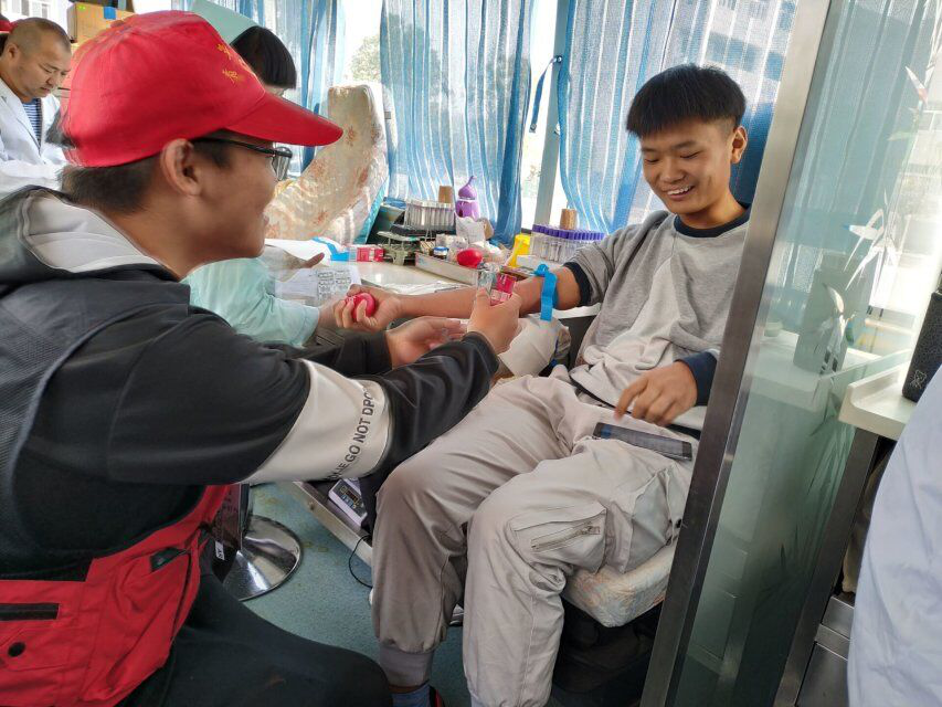 活动当天,同学们纷纷来到第一教学楼前有序排起队,依次进行信息登记、血液类型检验、静脉采血等环节。等待献血期间,同学们紧张而兴奋,他们为能给需要的人提供帮助、挽救更多的生命而感到开心。在献血区,同学们挽起袖管,有序按照医护人员的要求进行献血,献出自己对生命的关怀。