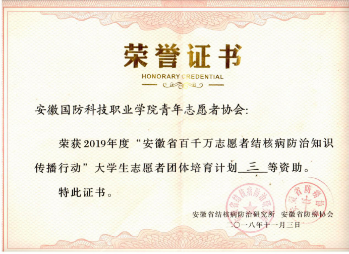 此次青年志愿者协会申请资助成功,是社会对是对万象城官网学生志愿者团体的充分认可,是对国防学子的社会责任感和青年使命担当意识的赞扬,使志愿者们能够积极开展结核病防治知识传播,为服务地方和学校防疫工作贡献一份力量。(供稿:武海蛟 司雪云)