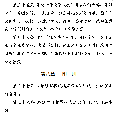 八、建立述职评议制度方面。建立了学生会述职评议制度,从述职评议对象、评议标准、民主测评等多方面规定了学生会工作人员述职评议的要求。每学期进行一次学生会工作人员述职评议,邀请各学院学生代表、学工部和团委老师参会。制度中明确在学生会组织工作人员参加评奖评优、测评加分等事项时,依据述职评议结果择优提名,未与其岗位简单挂钩。