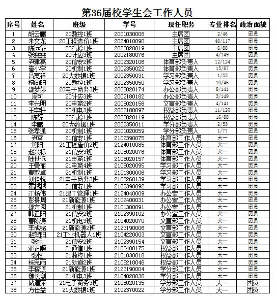 现将校学生会第三十六届工作人员名单公示如下:
