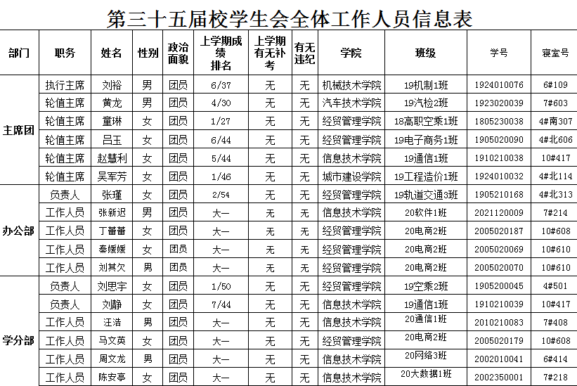 现将万象城官网校学生会第三十五届全体工作人员名单公示如下: