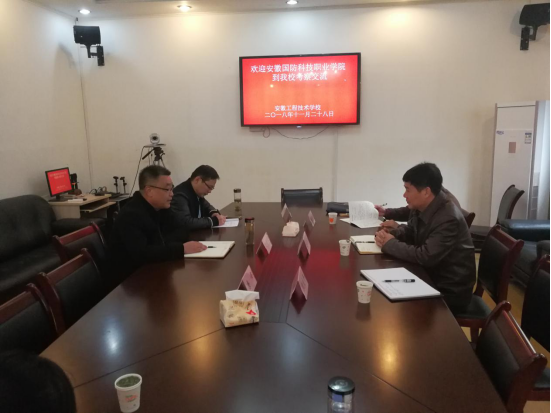 本网讯(机械技术学院 熊良平)2018年11月27至28日,校党委书记余嗣元带领机械技术学院党总支书记张宗江、经贸管理学院院长杨力、机械技术学院专业带头人熊良平一行四人先后赴寿县科技学校、安徽工程技术学校、宿州应用技术学校进行了走访调研,交流中高职衔接办学相关工作。