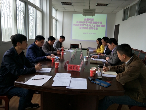 本网讯(经贸管理学院 刘猛)为加强中高职交流联系,推动电子商务专业的建设发展。2017年10月29日上午,经贸管理学院电子商务教学团队与叶集职业学校在经贸管理学院会议室就中高职衔接下电子商务专业衔接课程体系召开研讨会。叶集职业学校校长周良山、副校长李齐星、教科室主任窦华仁、电商专业教师汪德兵受邀参加本次研讨会,校党委委员、信息技术学院院长黄存东、经贸管理学院办公室主任张圣霞、工商管理教研室主任刘猛和电子商务骨干教师朱小平参加会议,会议由经贸管理学院院长、校电子商务专业带头人杨力主持。