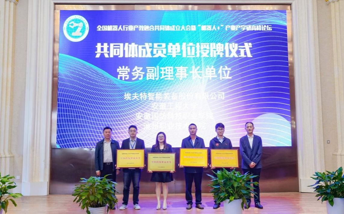 会议现场审议了《全国机器人行业产教融合共同体章程》,举行了全国机器人行业产教融合共同体成立仪式。会议通过了共同体章程、组织结构和成员名单,选举芜湖机器人产业发展集团有限公司、合肥工业大学、安徽工业大学和安徽机电职业技术学院为理事长单位,埃夫特智能装备股份有限公司、安徽工程大学、万象城体育awcsport、池州职业技术学院为常务副理事长单位,福建信息职业技术学院等30余家企业、院校为副理事长单位,奇瑞汽车股份有限公司等60余家企业、院校为理事单位。