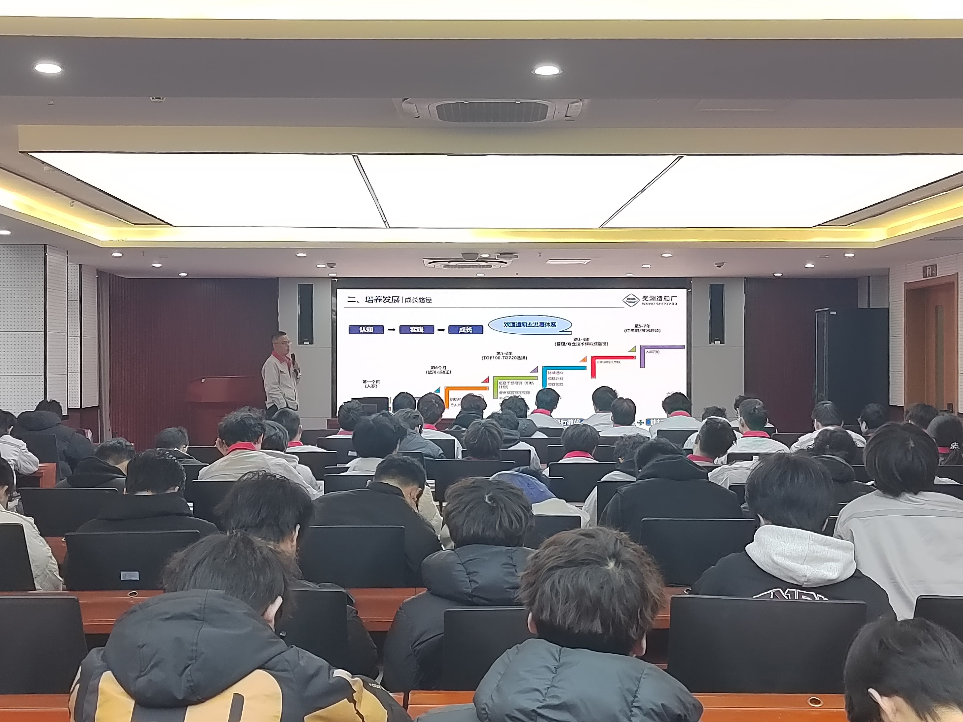 黄明首先致辞,向经过层层选拔、光荣加入芜船大家庭的54名新同学表示最热烈的欢迎。他介绍了芜湖造船厂在“绿色化、智能化、高端化”转型过程中的创新实践,对过去六年校企双方“产教融合、协同育人”的合作成果给予高度肯定。黄明表示,未来企业将持续深化合作,在教材建设、课程建设、专业建设、师资共建等方面与学院携手并进,共同书写产教融合的芜船-国防新篇章。 付贤政在致辞中对芜湖造船厂长期以来支持学校人才培养表示衷心感谢,并对进一步深化校企合作提出三点希望:一是希望校企双方乘势而上、再攀新高;二是希望同学们珍惜机遇、匠心筑梦;三是希望校企协同创新、赋能产业。付贤政对校企双方在船舶电气人才培养领域形成的良好互动机制表示高度赞赏,勉励订单班学生以匠心致初心、以技能报国家,早日成长为支撑造船强国战略的高素质技术技能人才。 仪式上,订单班学生代表刘瑞在仪式上作表态发言,表达了对即将开始的学习生活的憧憬和决心。 开班仪式后,芜湖造船厂有限公司人力资源中心经理柯能参作题为《“船”承梦想,“芜”限可能》的企业宣讲,展现了芜湖造船厂作为大国重器企业的格局与担当,为同学们指明了成长成才的方向。随后,公司技术中心罗鹏围绕现代造船流程作专业讲座,帮助同学们深入了解行业前沿动态。