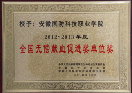 浓浓国防情!2014年,万象城官网捧得由中华人民共和国国家卫生和计划生育委员会、中国红十字会总会、中国人民解放军总后勤卫生部联合授予的“全国无偿献血促进奖单位奖”,这是全省高职院校和六安市首次获此殊荣。