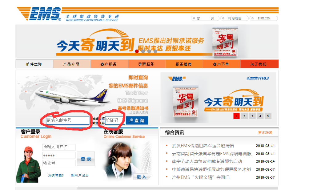 第二步:点开http://www.ems.com.cn/,输入单号和验证码,即可查询录取通知书邮寄状态。(操作如下图)