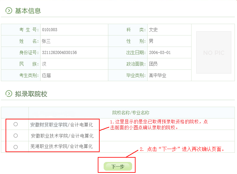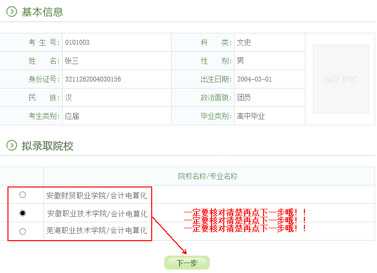 特别提醒:高职扩招录取确认只有在规定时间内(12月10日-12日),在规定网站(gkbm.ahzsks.cn)上操作方为有效。请各位考生一定要妥善保管自己的考生号、身份证号等个人信息,切勿泄露给其他人,更不要委托他人代替自己确认。一旦确认了录取院校,是不能修改的!!!