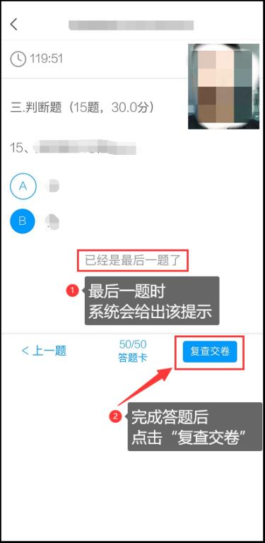 4.开始答题并交卷:每题选择正确答案点击该选项即可,点击右下角“下一题”继续作答;到最后一题时系统会提示“已经是最后一题了”,可点击“复查交卷”进行答题情况核查。