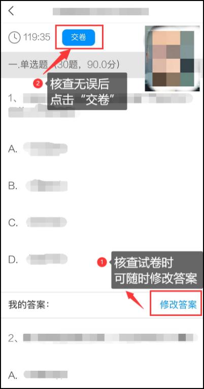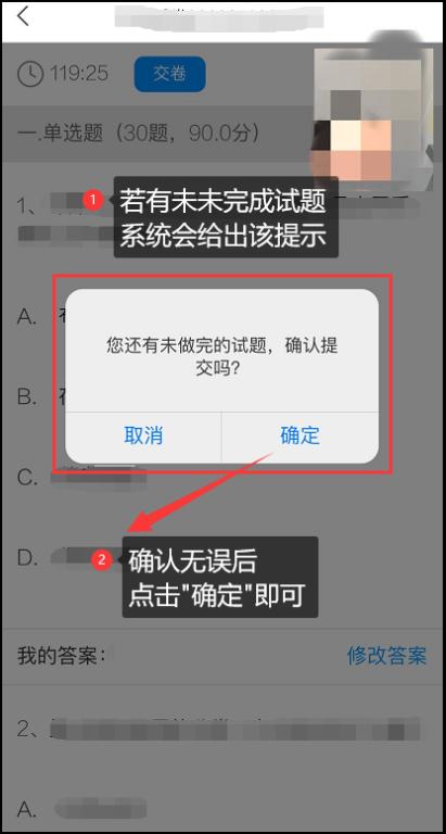 5.核查作答情况时,可修改选择答案;确认无误后,点击最上方的“交卷”按钮,并确认提交。(若存在未作答题目,系统会提示,请注意核查!)