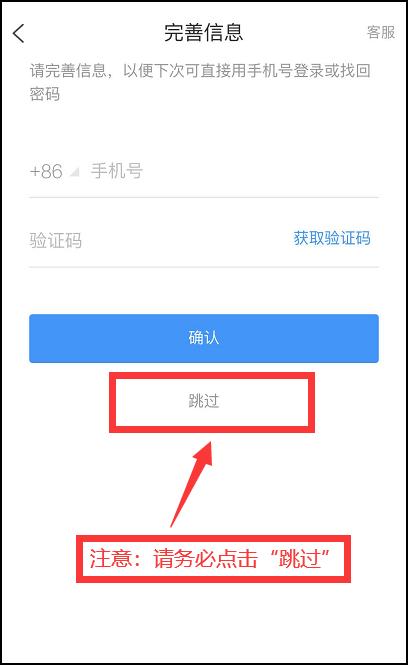 (2)完善信息处,请务必点击点击“跳过” !切勿绑定手机号!如不小心绑定,基本无影响。