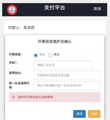 第四步:输入手机号码点击“保存”,确认支付。即可完成缴费(注意:发票抬头和统一社会信用代码不用填,只需填写手机号后点击保存即可)