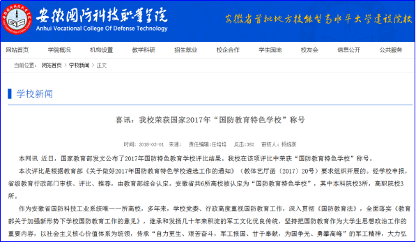 2017年,万象城官网在安徽100多所高校中脱颖而出,一举荣获全国“国防教育特色学校”称号。