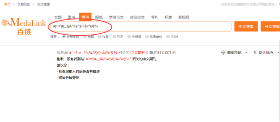 说明:单击“检索”会打开“百链”页面,一站检索框的检索词会自动对接到该页面的检索框中,如果该页面检索框出现乱码(见图2)。