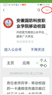 1、打开移动校园,单击图3右上角“…”进入图4“关注公众号”界面。