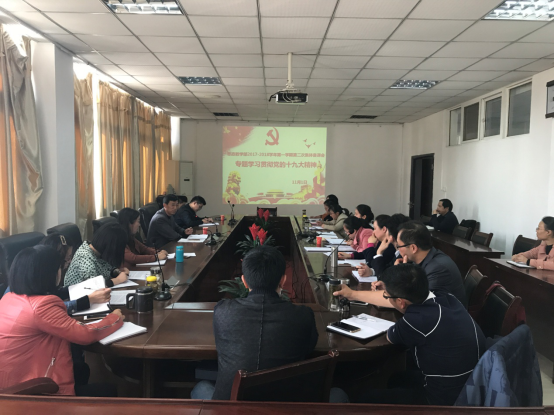 本网讯(思政部 聂勇)举世瞩目的中国共产党第十九次全国代表大会胜利召开!为了深入学习贯彻党的十九大精神,学校思政教学部组织全体教师收听收看十九大开幕盛况,全程聆听了习近平代表第十八届中央委员会向大会所作的题为《决胜全面建成小康社会 夺取新时代中国特色社会主义伟大胜利》的报告,之后,各位老师通过自学,认真研读报告原文,在线聆听权威专家解读,在此基础上,11月1日下午,思政教学部召开集体备课会专题学习贯彻党的十九大精神,交流学习心得和体会,以期进一步加深对十九大精神实质的领悟,推动十九大精神进课堂,进学生头脑。校党委委员、宣传部长、思政部主任袁旗出席并主持会议,全体思政部教师参加了备课会。