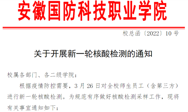 防患未然,积极配合属地开展全员核酸检测。学校积极加强与属地联系,在金安区东市街道的大力支持下,对校内全体人员开展核酸检测。