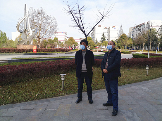 副校长袁旗(左)现场查看校园基础设施维护情况并听取总务处长余嗣俊现场汇报