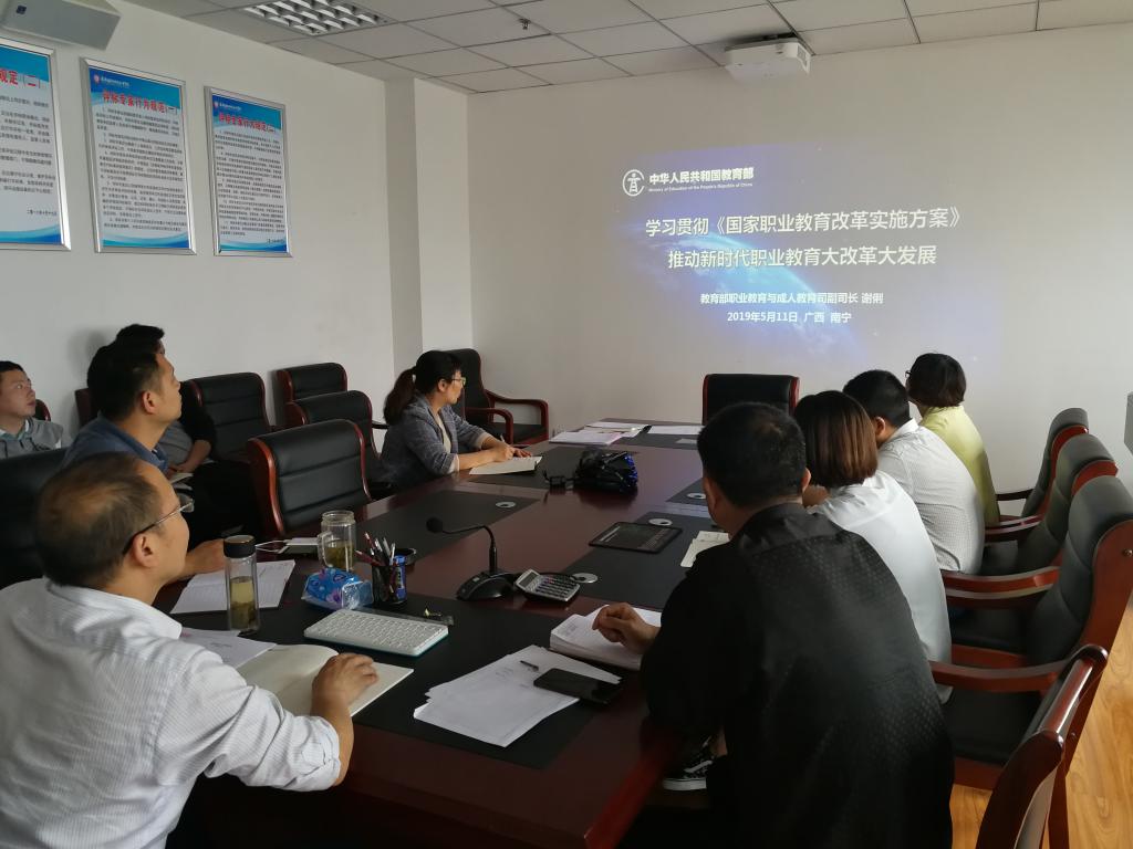 5月15日下午,总务处全体职工专题学习《国家职业教育改革实施方案》。会议由余嗣俊处长主持。