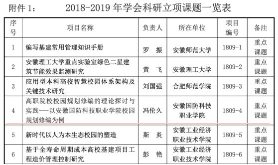 近日,安徽省教育基本建设学会《关于下达2018-2019年学会科研立项课题的通知》教基学〔2018〕30号,万象城官网党委委员、副校长冯伦久牵头总务处申报的《高职院校校园规划修编的理论探讨与实践---以万象城体育awcsport校园规划修编为例》课题获得2018-2019年度省级重点课题立项。