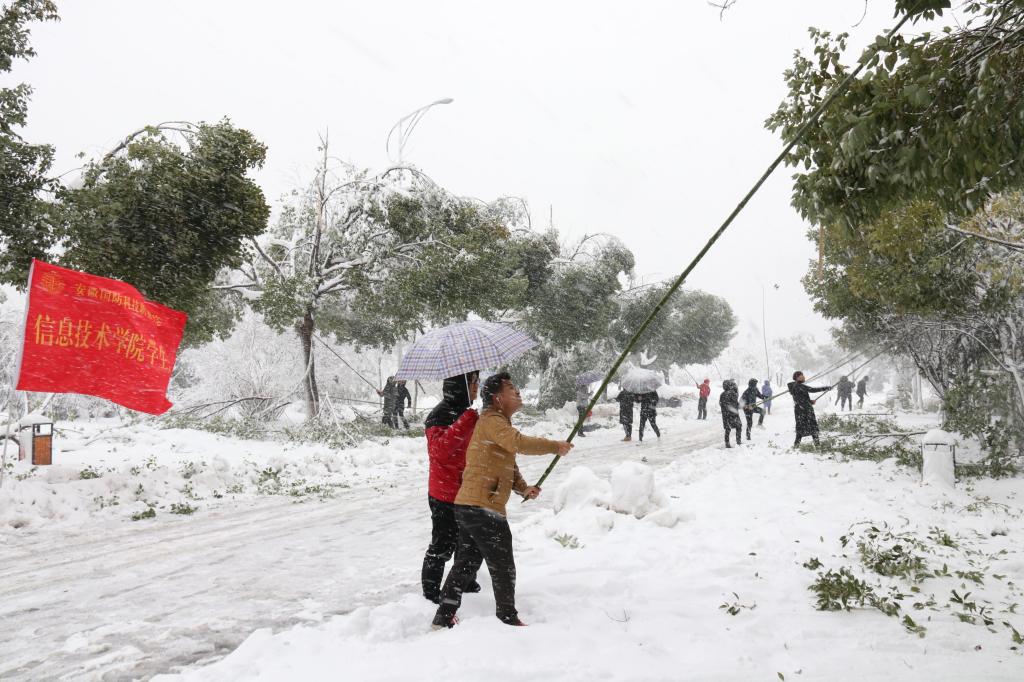 但是,持续的降雪也使校内的道路、树木被厚厚的积雪覆盖。为了消除安全隐患,确保师生的人身安全,校内各部门积极开展安全排查,投入到除雪工作中。