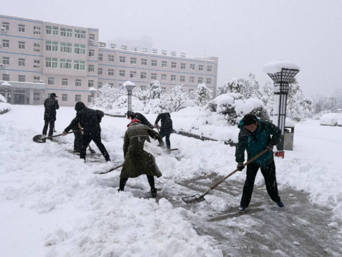 1月4日一早,学校领导和相关部门职工早早来到校园,利用铁锹、竹竿等工具在校园各处开展义务扫雪、除雪活动,为广大师生员工开辟安全通道,整个校园洋溢着劳动的热情和欢声笑语。