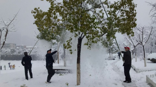 从3日夜里开始,学校相关部门就积极组织后勤和物业对校园绿化苗木进行除雪,同时清扫人行通道。