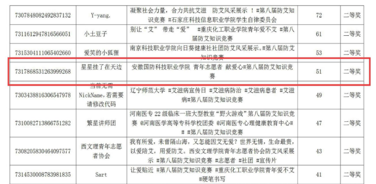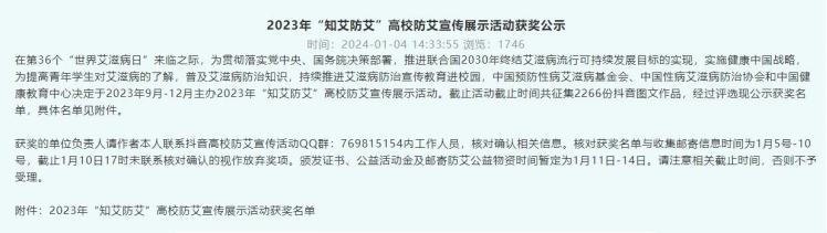 本网讯(总务处 万自玲)为贯彻落实党中央、国务院决策部署,推进联合国2030年终结艾滋病流行可持续发展目标的实现,实施健康中国战略,提高青年学生对艾滋病的了解,普及艾滋病防治知识,持续推进艾滋病防治宣传教育进校园,中国预防性病艾滋病基金会、中国性病艾滋病防治协会和中国健康教育中心于2023年9月—12月主办了2023年“知艾防艾”高校防艾宣传展示活动,万象城官网学子作品在官方征集2266份抖音图文作品中脱颖而出,荣获二等奖。