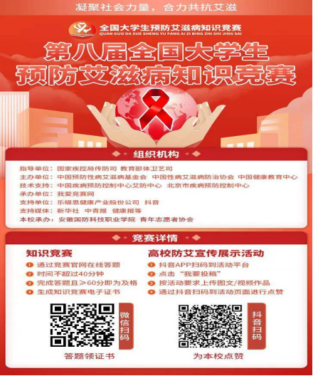 《第八届全国大学生预防艾滋病知识竞赛》是中国预防性病艾滋病基金会、中国性病艾滋病防治协会、中国健康教育中心主办的公益性校园防艾活动,活动时间为2023年11月15日-12月30日,参加活动对象为全国大学生(包括本专科生和研究生)。