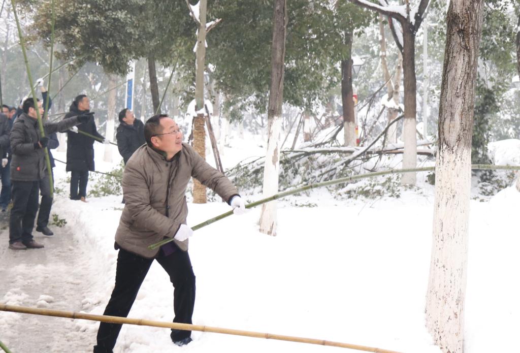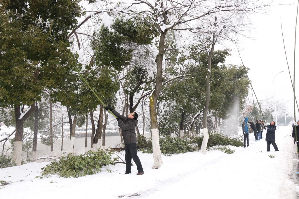 在包保路段,万象城官网党员干部在校党委委员、副校长冯伦久同志的带领下,用长竹竿将积在树顶端的雪敲打掉,以减轻树枝树叶负担,防止树枝折断,保障市民出行安全。同志们互相提醒互相帮助,干的热火朝天,一些同志热的脱下了厚厚的棉衣。经过一个多小时的努力,基本清理完道路两边景观树上的积雪。虽然累了点,但大家觉得为抗雪救灾工作作出贡献,尽到了一个党员干部、一个六安市民的责任和义务。