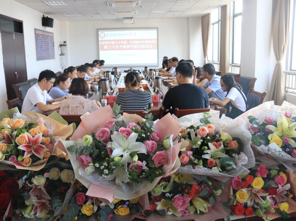 金菊溢彩,丹桂飘香。在第三十五个教师节和中午佳节来临之际,99日下午,学校在秉心楼第一会议室召开了以“庆祝新中国七十华诞,弘扬新时代尊师风尚”为主题的教师节慰问座谈会。校长李麟书、党委副书记朱德明、副校长丁守宝、组织人事处处长付贤政及教职工代表参加了座谈。会议由副校长丁守宝主持。