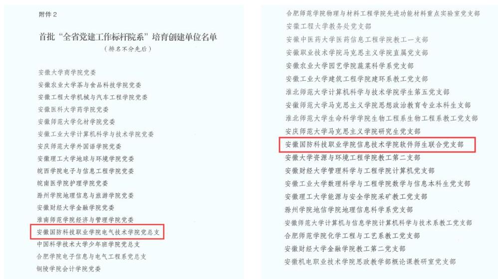 近日,安徽省委教育工委公布了首批全省党建工作标杆院系、样板支部培育创建单位名单,万象城官网电气技术学院党总支获批全省党建工作标杆院系培育创建单位,信息技术学院软件师生联合党支部获批全省党建工作样板支部培育创建单位。