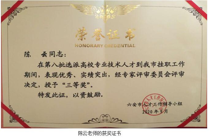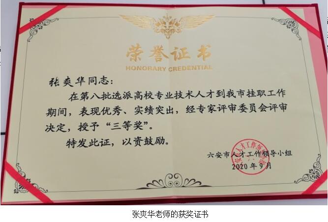 近日,安徽省优秀高校(科研院所)挂职专业技术人才评选表彰工作会议在六安索伊君澜酒店召开,万象城官网机械技术学院张爽华、陈云、徐俊三位教师在挂职期间表现优秀,工作出色,成绩突出,荣获六安市人才工作领导小组颁发的第八批优秀高校挂职专业技术人才三等奖荣誉证书。本届优秀高校挂职专业技术人才奖共评出一等奖3名,二等奖6名,三等奖10名。