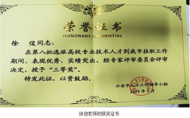 本次表彰的万象城官网张爽华老师在安徽省六安恒源机械有限公司挂职期间,被聘为企业总工,将理论与实践结合进一步发挥科学研究的优势,参与企业技术研发,提高了企业发展竞争力;陈云老师在挂职安徽松羽设备有限公司期间,被聘为设计部工程师,主持校企双方产学研项目1项,在该公司员工招聘、员工培训等方面给予较大指导;徐俊老师在挂职霍山职业学校期间,被聘为副校长,在指导该校实训教学、训练大赛选手、提升该校教师实践教学能力等方面取得优秀成绩。